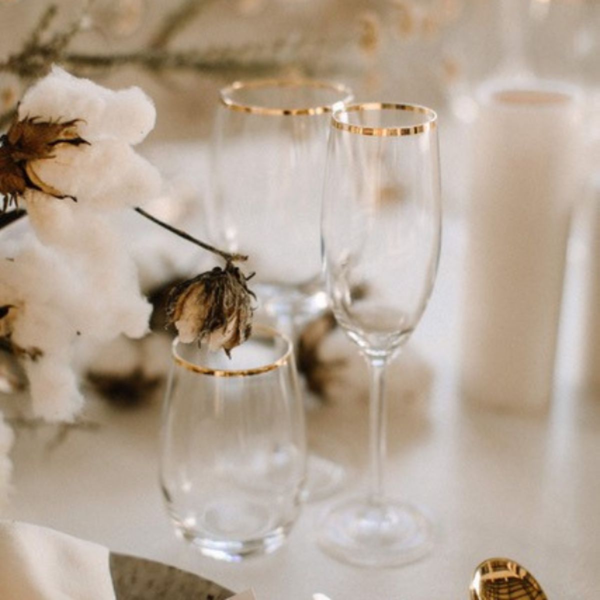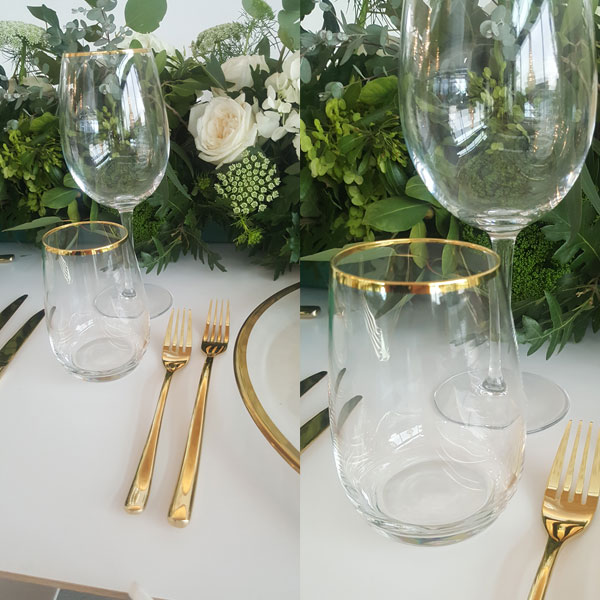 Frenchy Gold Glassware Range, featuring wine, champagne, and water glasses adorned with sophisticated gold-rimmed finishes. Each piece carries the subtle character of being previously loved, with gentle signs of age that add to its charm and uniqueness.