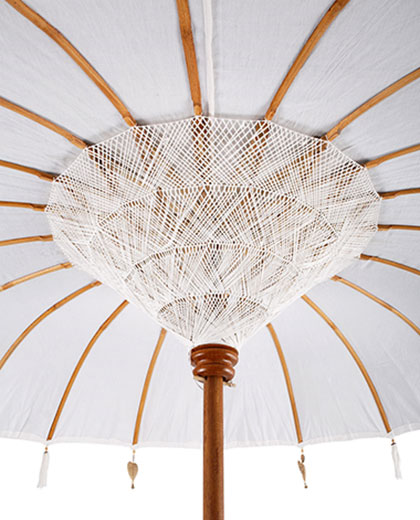Give your outdoor decor touch of luxury with stunning Balinese sun umbrella shades. Our Balinese wedding umbrellas are hand made of wood and cotton. Each shade beautifully hand carved and decorated with ornamental tassels, metallic hearts and bells White Material.